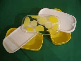 Plastic, with yellow/white “bubble” design and the words “The life that bounced”.